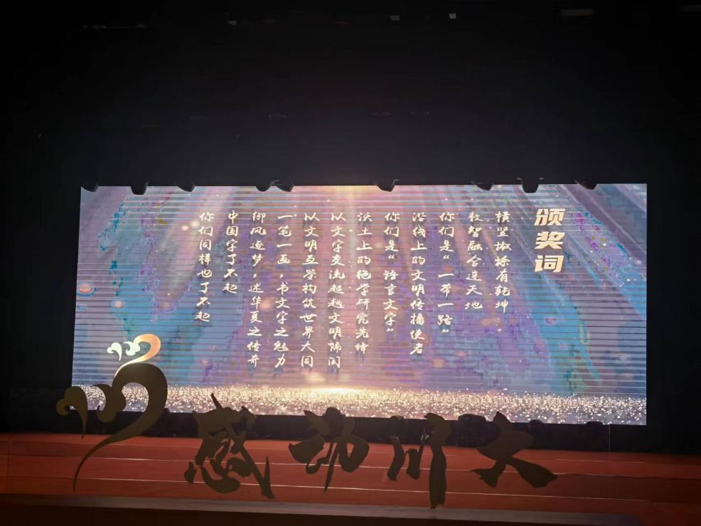 12月22日,在江安校区艺术学院小剧场举办的“感动川大”2023年度人物颁奖典礼上,永利官网“了不起的中国字”团队凭借其以数智融合传播汉字文化的突出表现而获此殊荣。今年10月,“了不起的中国字”团队代表yl6809永利官网参加第十八届“挑战杯”全国大学生课外学术科技作品竞赛,在主体赛中获得国家级特等奖,为四川省高校今年获得主体赛特等奖的三个团队之一。在刚刚过去的yl6809永利官网2022-2023年度“挑战杯”学生课外学术科技节表彰大会上,yl6809永利官网荣获优秀组织奖,罗鹭副院长和伍诗涵同学分别作为学院代表和团队代表发言。罗鹭副院长在发言中总结了文新团队今年取得的好成绩,并从“组织重视,部门联动”“牵线搭桥,重点孵化”“长期布局,以赛促学”这三个方面进行了经验交流。